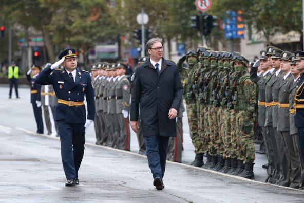 "Danas ću govoriti kraće nego ikada, ne zbog kiše, već zato što mislim da ste mnogo toga videli i naučili, a i da nikada nije bilo manje potrebno da se govori dugo. Hvala vašim roditeljima i porodicama, što vas nisu sebično čuvali za sebe, već su vašu mladost i hrabrost ponudili Srbiji, jedinoj koju imamo. Vi danas postajete neko ko je uvek u prvim redovima odbrane otadžbine" - kazao je predsednik.