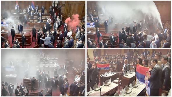 U Skupštini Srbije danas je počela prva sednica redovnog prolećnog zasedanja. Nakon usvajanja dnevnog reda, došlo je do guranja i tuče među poslanicima, nakon čeka su bačene baklje.