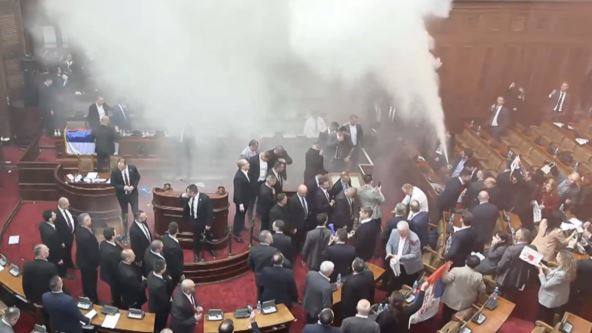 U Skupštini Srbije danas je došlo do nereda i tuče, pošto su poslanici opozicije, nakon usvajanja dnevnog reda na sednici Skupštine, u sali bacili dimne bombe i upalili baklje.