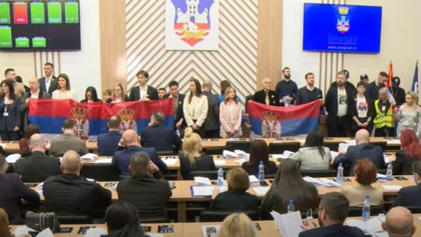 Odbornici opozicije su iskoristili 10 minuta prava na obraćanje, povodom predloga dopune dnevnog reda, da puštaju "Bože pravde" himnu više puta uzastopno, stoje i drže zastave Srbije.