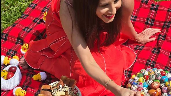 Ona je na svom "Instagram" nalogu pokazala kako se provodi Uskrs u njihovom domu. Ona je u dvorištu napravila mali piknik za svog sina i na fotografiji se vide uskršnja jaja, štrudle i krofne.