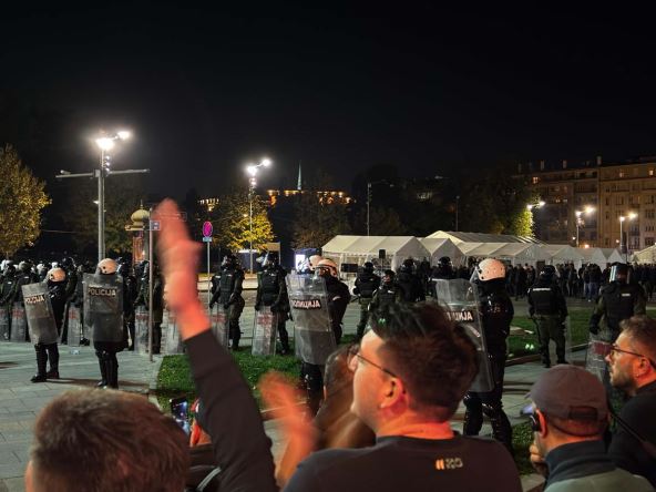 "Ministarstvo unutrašnjih poslova i Bezbednosno-informativna agencija najoštrije osuđuju večerašnje incidente koji se dešavaju u centru Beograda, u neposrednoj blizini zgrade Narodne skupštine Republike Srbije. Organizovana grupa učesnika neprijavljenog skupa, okupljena u ulici Kneza Miloša, napala je građane koji su se nalazili na prijavljenom javnom skupu, u Pionirskom parku, bacajući različite predmete i pirotehnička sredstva u pravcu okupljenih.