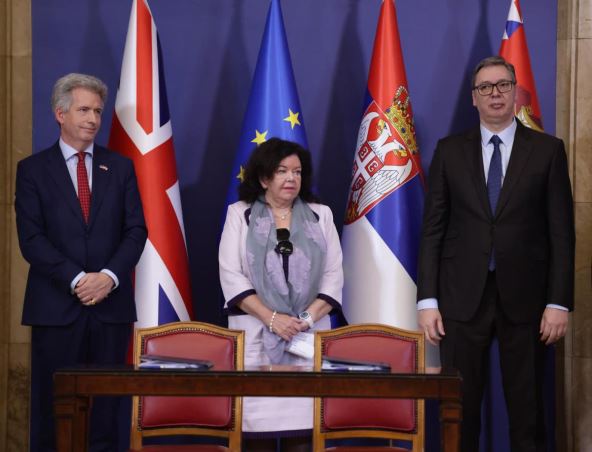 Nakon održanog sastanka sa specijalnom izaslanicom Ujedinjenog Kraljevstva Velike Britanije i Severne Irske za Zapadni Balkan Karen Pirs u zgradi predsedništva, predsednik Vučić prisustvuje potpisivanju ugovora između Republičkog fonda za zdravstveno osiguranje i AstraZeneca.