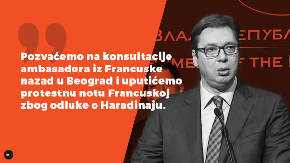 "Ne želim da ugrozim stabilnost Srbije i njenu budućnost bilo kakvim hitnim ili hitrim potezom. Ovo je najviši stepen našeg protesta, pred otkazivanje gostoprimstva francuskom ambasadoru. Mislim da smo našli pravu meru i najbolji način da to uradimo", rekao je Vučić.