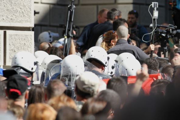 Demonstranti su se potom približili ulazu u zgradu, bacali flaše a portapol "Dveri" ih je pozvao da ostanu mirni.