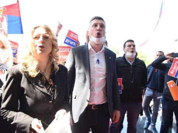 Obradović i pristalice Dveri drže transparente "Dole vlada", "Da li korona zavisi od izbora", "Ne može Đurđevdan, ali izbori mogu", nose zastave Srbije i stranačka obeležja, i dovikuju da je predsednik Srbije "izdao Kosovo".