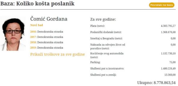 Prema podacima CINS-a, Gordana Čomić je bila među 10 "najskupljih" predstavnika u parlamentu.