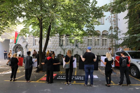 Aktivistkinje i aktivisti organizacije "Žene u crnom" okupili su se danas ispred ambasade Belorusije u Beogradu.
