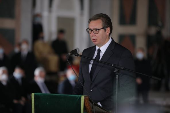 "Njegova svetost je sklopio oči sa samo jednom željom da njegov hram i njegov san nikada ne porušimo i da se u hramu okupljamo u ljubavi i miru", rekao je Vučić patrijarhovu poslednju želju.