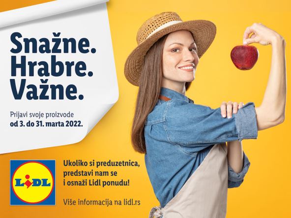 U susret osmom martu, Danu žena, kompanija Lidl Srbija raspisala je konkurs „Snažne. Hrabre. Važne.“ koji ima za cilj da okupi uspešne preduzetnice u Srbiji i promoviše njihove proizvode. Konkurs traje do 31. marta, do kada sve zainteresovane poslovne žene mogu da dostave potrebnu dokumentaciju za prijavu putem mejla, nakon čega će najmanje trideset artikala naći svoje mesto u okviru akcijske nedelje na policama u preko 57 Lidl prodavnica širom Srbije.