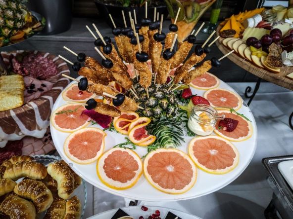 Na fotografijama MONDO reportera može se videti da su prisutni mogli da se goste pršutom, mesom, kiflicama, velikim izborom aranžiranog voća, raznim kanapeima, salatama...