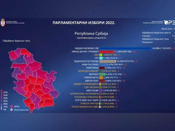 Prema preliminarnim rezultatima RIK, na osnovu 94,08 odsto obrađenog biračkog mesta, na parlamentarnim izborima lista Zajedno možemo sve - Aleksandar Vučić dobila je 43,05 glasova, slede Ujedinjeni za pobedu Marinika Tepić 13,44, Ivica Dačić premijer 11,57, NADA 5,36, Moramo 4,51, Dveri 3,85, Zavetnici 3,76...
