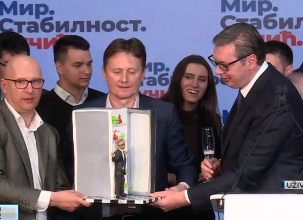 Nakon što je proglasio pobedu na predsedničkim i parlamentarnim izborima, predsednika Srbije Aleksandra Vučića su iznenadili tortom na kojoj se nalazi on kako izlazi iz frižidera.