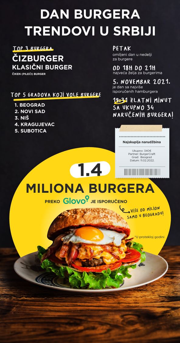 A da smo i mi Srbi veliki ljubitelji burgera, dokazuju i podaci koje je beležio Glovo, omiljeni servis za dostavu, koji je tokom prošle godine na prag mnogih svojih korisnika isporučio ravno 1,4 MILIONA burgera! Ispostavilo se da su gradovi koji najradije uživaju u burgeru Beograd na prvom mestu, zatim Novi Sad, Niš, Kragujevac pa Subotica! Većina tih, još uvek toplih burgera koji vam stižu na željenu adresu kako biste uživali u njima gde god da poželite – naručuje se baš u petak, koji u Glovu, od milošte nazivaju “vrućim danom za Burgere”. Pogotovo u periodu od 18 do 21h. Dakle, znamo šta ste radili prošli petak!