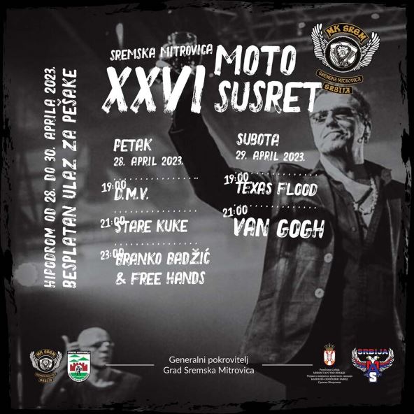 Ovaj klub je osnovan 1976. godine i smatra se da je najstariji u Srbiji. Kroz moto susret spajaju ljubitelje motociklizma kao sporta i građane Sremske Mitrovice, gde već dve i po decenije organizuju susret koji je pravi spektakt, što će se desiti i ove godine. Od petka 28. aprila do nedelje 30. aprila, na Hipodromu u Sremskoj Mitrovici, motoriste i posetioce očekuju tradicionalni defile, zatim takmičarske igre, a naravno tu su i dve koncertne noći. U petak od 19 časova redom nastupaju D.M.V, Stare kuke i Branko Badžić & Free Hands, dok u subotu nastupaju Texas Flood i Van Gogh. Generalni pokrovitelj ovogodišnjeg susreta je Grad Sremska Mitrovica.
