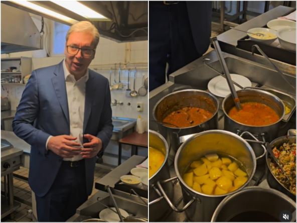 Na snimku se vidi da je predsednik posetio kuhinju u Predsedništvu. "Pred sastanak sa listom "Srbija protiv nasilja", ali pošto oni nikada ne dolaze i neće da razgovaraju sa autokratama, diktatorima, ja sam rešio da posetim ove divne dame koje rade u kuhinji i ljude u Predsedništvu i da vidim šta su lepo spremili za one koji rade u ovoj zgradi", rekao je predsednik Vučić.