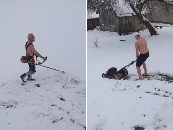 Tako su na društvenim mrežama počeli da kruže snimci i fotografije napadalog snega širom Srbije. Jedan snimak sa Fejsbuk stranice "Užice - oglasna tabla" nasmejao je mnoge. Košenje trave u dvorištima od danas biće zamenjeno čišćenjem snega, a dvojica Užičana  odlučila su da se u skladu sa tim i našale. Oni su u šorcevima i bez majica izašli u dvorište, koje je poprilično obelelo snegom, i počeli sa košenjem.