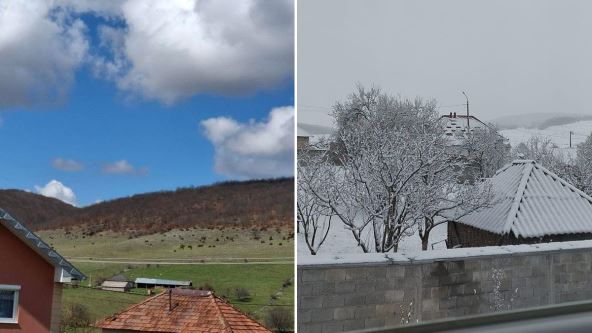 Jučerašću sunčan i prolećni dan pretvorio se u maglovit i hladan zimski. Sneg se zabeleo na krovovima i drveću, a umesto trave sada se nalazi snežni pokrivač, koji je dostigao visinu oko tri centimetara.