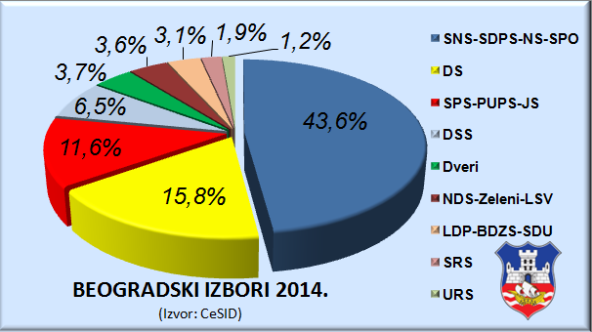 Prema preliminarnim podacima CeSID-a za Beograd SNS je osvojila 43,6 odsto glasova, odnosno 63 mandata, DS se bolje kotira nego u republici sa 15,8 odsto glasova tj. 22 mandata. SPS je na trećem mestu sa 11,6 odsto - što nosi 16 mandata, a DSS 6,5 odsto ili devet mandata.