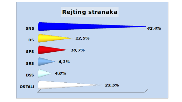 Ako bi se glasovi neodlučnih proporcionalno raspodelili, istraživanje pokazuje da bi SNS dobio 42,4 odsto, DS 12,5 odsto, a SPS 10,7 odsto glasova, pri čemu bi cenzus prešla još i Srpska radikalna stranka sa 6,1 odsto, a blizu tog praga sa 4,8 odsto bila bi i Demokratska stranka Srbije.