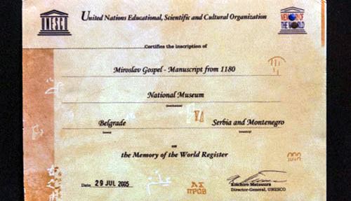 "Ne mogu da kažem da smo se potpuno dogovorili, ali smo blizu toga da se Srbiji vrati list koji nedostaje iz Miroslavljevog jevanđelja i koji je u muzeju u Sankt Peterburgu, a Srbija da vrati Rusiji ikonu Bogorodice Vladimirske iz 17. veka, koja se nalazi u Narodnom muzeju u Beogradu", rekao je Nikolić posle susreta sa Putinom u Kremlju.