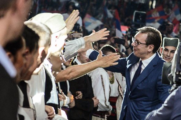 Lider SNS Aleksandar Vučić popeo se na binu uz veliki aplauz pristalica i istakao da od Srbije neće ništa da uzme, već da je spreman da joj sve da.