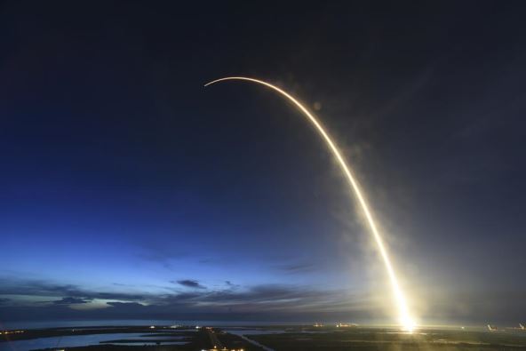 Na snimku se vidi kako poleću rakete i pogađaju cilj na noćnom nebu.