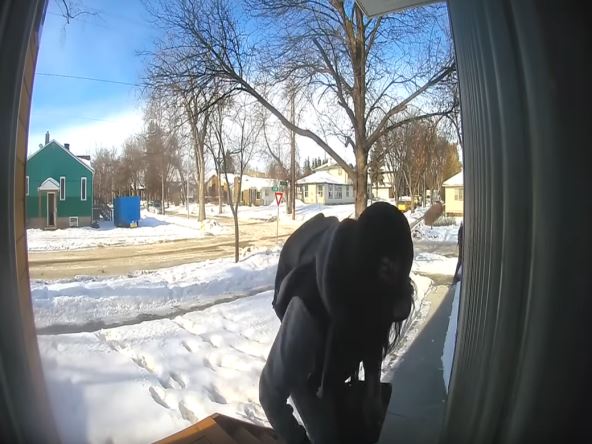 Na snimku se vidi žena kako prolazi ispred kuće u Edmontonu na čijem ulazu je bio ostavljen paket.