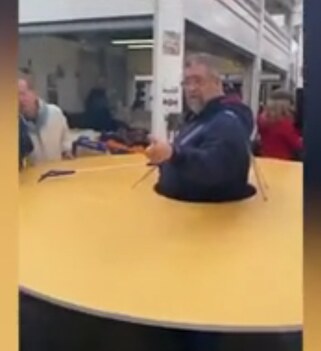 Na snimku se vidi čovek kako ulazi u samoposlugu opasan ogromnim kartonskim pojasom i "naoružan" hvataljkama kako ne bi rukama dirao predmete po radnji.