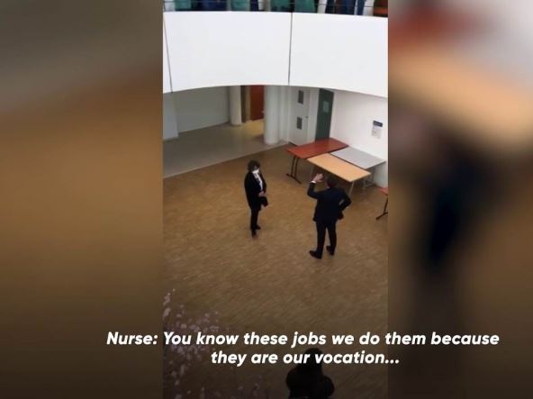 Makron joj je uzvratio: Znate da sam jedini u svojoj porodici koji nije zdravstveni radnik, a medicinska sestra je završila: Mi zdravstveni radnici smo siromašni. I sutra bismo mogli biti mi ti koji leže u ovim krevetima. Ne možemo da radimo sa nedostatkom radnika."
