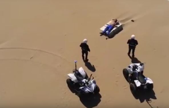 Na snimku se vide policajci kako dronom nadgledaju plažu i onda opkoljavaju čoveka koji je vidljivo iznenađen dolaskom policije na kvadovima.