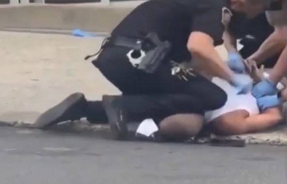 Na snimku se vidi policajac koji kleči na vratu i glavi muškarca tokom privođenja.