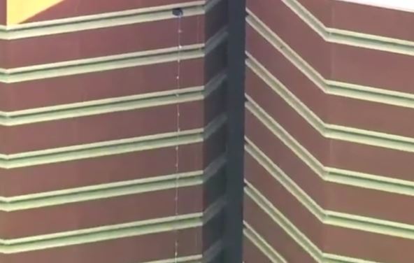 Na fotografijama se vidi konopac od listova zavezanih u čvorove koji još visi od zgrade.