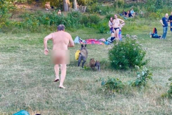 Na fotografijama koje su se pojavile na društvenim mrežama, vidi se nag muškarac srednjih godina koji trči za divljim svinjama.