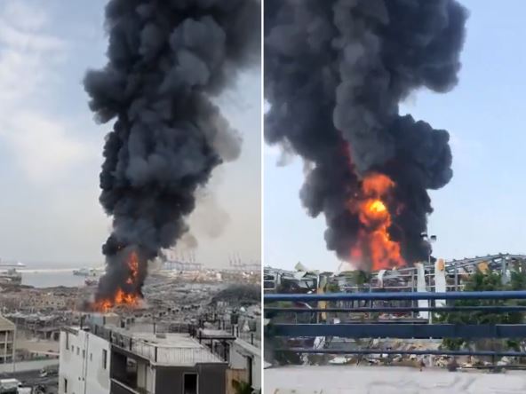 Na televizijskim snimcima vide se vatrogasci kako pokušavaju da ugase požar u oblasti okruženoj ostacima skladišta, koje je uništeno u eksploziji prošlog meseca.