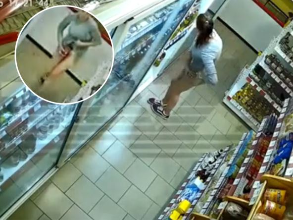 Brineta, obučena u pripijenu sivu haljinu, prvo je viđena kako uzima proizvod sa police iznad zamrzivača, a zatim podiže haljinu i gura artikal u gornji deo gaćica. Ukupno se vidi da je žena stavila najmanje šest artikala u svoj donji veš.
