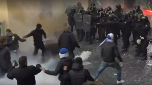 Mnogi demonstranti nisu imali maske. Pošto je policija saopštila da je njihov broj veći od 500, organizatori su okončali skup. Ali neki demonstranti su ostali na trgu i počeli da gađaju policiju flašama, kamenicama i drugim predmetima.