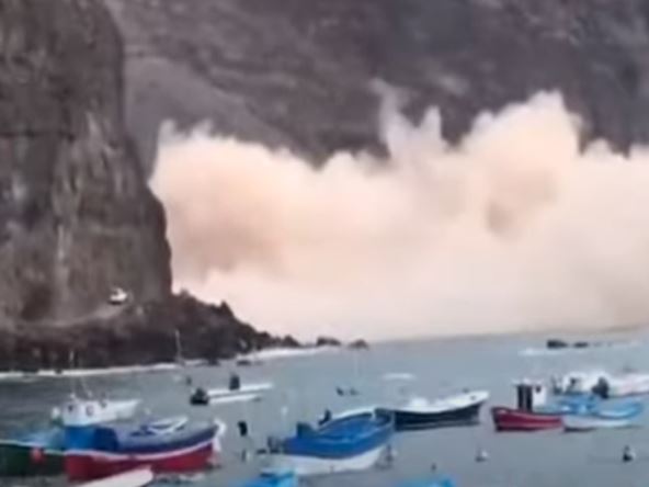 Na snimku se čuje vrištanje dok se deo stene urušava u more. Španija, pod čijom su ingerencijom Kanari, proglasila je vanredno stanje na ostrvu La Gomera zbog straha da su pod lavinom kamenja ostali zarobljeni penjači.