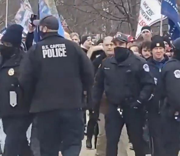 Na društvenim mrežama pojavio se snimak na kome se vidi kako je policija ispred Kapitola otvorila barikade, odnosno sklonila ogradu, i pomerila se da pristalice Donalda Trampa mogu da krenu ka zgradi.