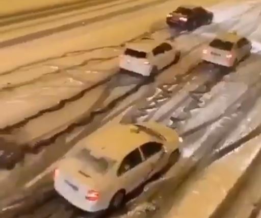 Par vozača koji su se usudili da pokušaju da pomere svoja vozila deluju kao da učestvuju u "trci puževa", dok svi ostali ni ne pokušavaju da voze po zaleđenom putu.