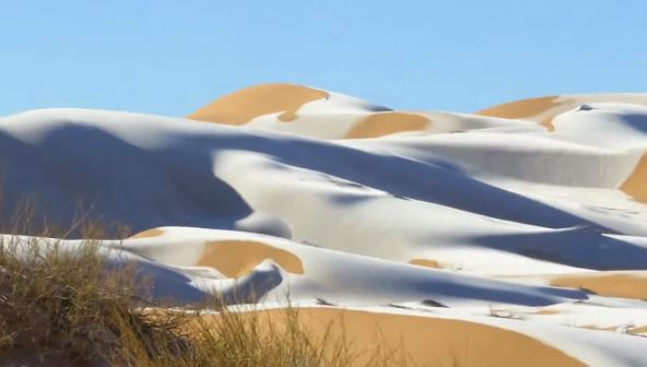 Na snimcima se može videti kako tanak sloj snega prekriva peščane dine u Sahari.