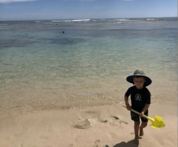 Tailija je uslikana sina Levija koji se igrao sa žutom lopaticom na pesku u prvom planu, dok se njegov otac Dankan vidi u daljine, u gornjem levom uglu dok roni s maskom i uživa u vodi.