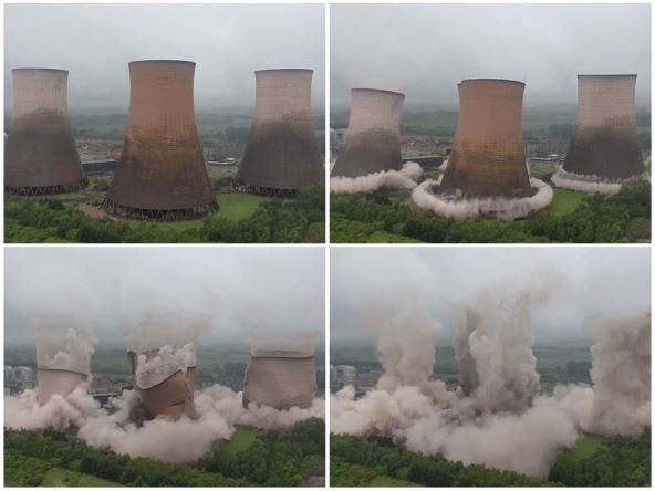 Četiri rashladna tornja u bivšoj britanskoj termoelektrani "Radžli" u Stafordširu u Engleskoj srušena su u kontrolisanoj eksploziji. Na video snimku se vidi kako tornjevi, visoki 117 metara, nestaju u roku od samo nekoliko sekundi.