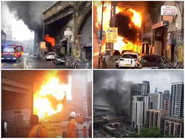 Tri komercijalna prostora, šest automobila i telefonska govornica pale se nakon što je izbio požar u garažama ispod železničkih lukova. Ekipe londonske Hitne pomoći na licu mesta leče jednog muškarca, ali nije bilo drugih izveštaja o povredama.