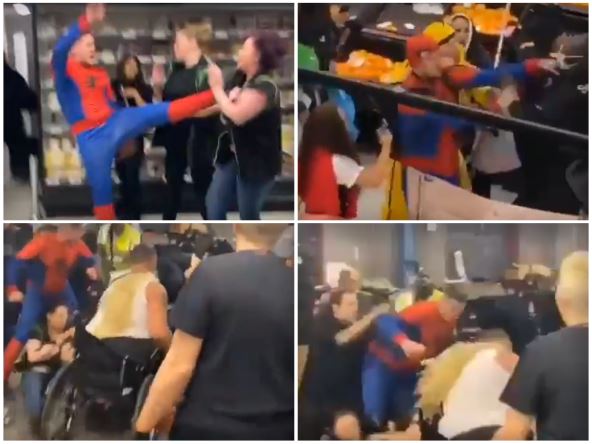 Video snimci pokazuju kako muškarac u odeći Spajdermena udara radnicu marketa u lice, a zatim je udara nogom i tuče druge radnike i kupce dugačkim metalnim predmetom.