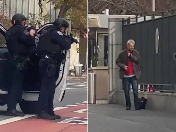 Čuje se i kako policija govori: "Spusti pištolj. Postoje bolji načini da pošaljete svoju poruku." Policajci stoje s uperenim oružjem u osumnjičenog izdajući svoja upozorenja.