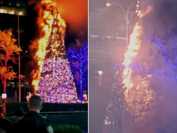 Snimak objavljen na društvenim mrežama pokazuje plamen i dim kako bukte sa okićenog drveta nešto posle ponoći ispred zgrade medijske korporacije.