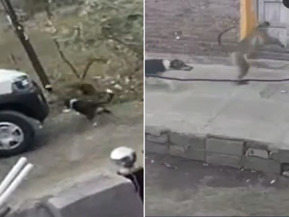Na jednom snimku životinjskog rata, mali pas se može videti u kandžama primata blizu ivice zgrade.