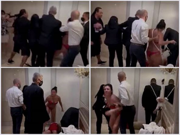 Čovek na recepciji se čuje kako se svađa sa parom, kada se žena probija kroz malu gomilu ljudi da ga stigne i ošamari ga obema rukama. Kao odgovor, on je gura nazad dok članovi osoblja pokušavaju da je odvuku od njega.