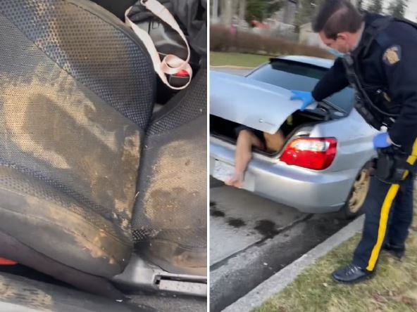 Policajci su stigli na mesto događaja i zatekli automobil iz čijeg prtljažnika vire muškarčeve noge. Čuje se kako ga pitaju može li da obuče pantalone, i dodaju "da bi to jako cenili".